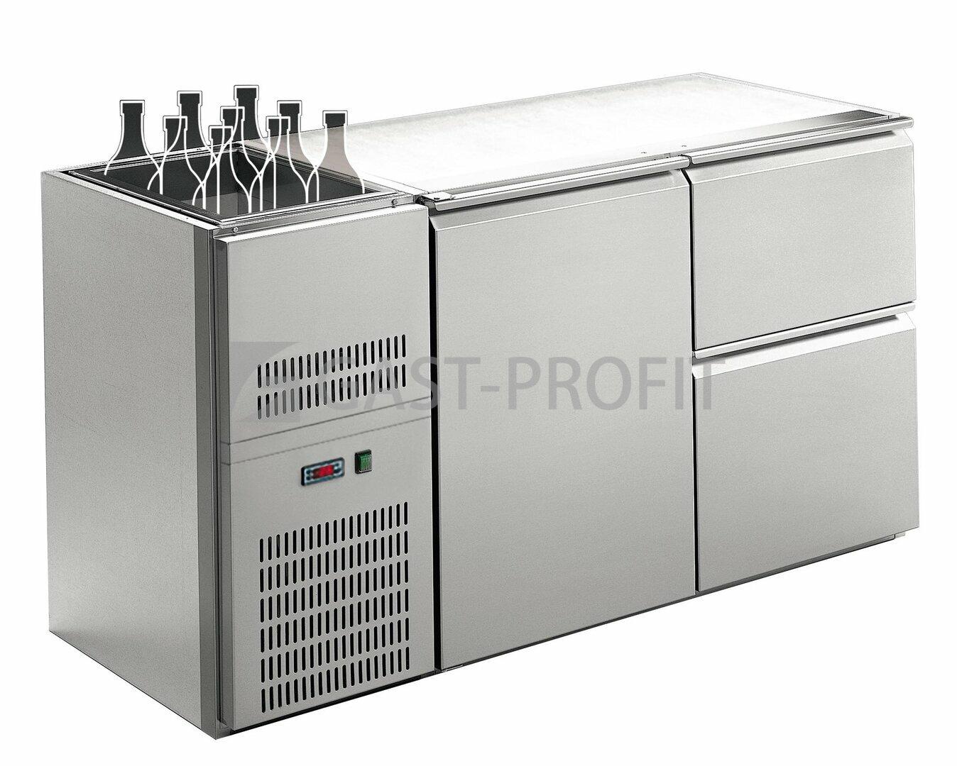 Dvousekcový barový chladící stůl. Model v celonerezovém provedení (AISI 304), s chlazenou vanou (312x515xh250) nad agregátem (vlevo). Digitální ovládání, ventilované chlazení, aut.odtávání (připojení na odpad). Stoly ve standardu dodávány bez vrchní pracovní desky (viz.příslušenství). Umístění agregátu standardně vpravo (REGD) na objednávku možno umístit agregát vlevo (model REGS). Modely je možno dodat v provedení s dvouokruhovým systémem chlazení (samostatné nastavení teploty vany a spodního chladícího prostoru (dveře/zásuvky), případně ve výbavě LUXUS (masivní panty a zámky dveří/zásuvek).
