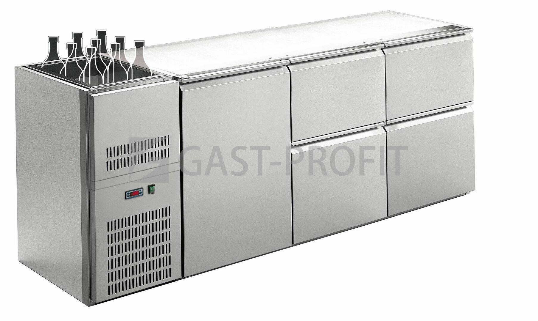 Třísekcový barový chladící stůl. Model v celonerezovém provedení (AISI 304), s chlazenou vanou (312x515xh250) nad agregátem (vpravo/vlevo). Digitální ovládání, ventilované chlazení, aut.odtávání (připojení na odpad). Stoly ve standardu dodávány bez vrchní pracovní desky (viz.příslušenství). Umístění agregátu standardně vpravo (REGD) na objednávku možno umístit agregát vlevo (model REGS). Modely je možno dodat v provedení s dvouokruhovým systémem chlazení (samostatné nastavení teploty vany a spodního chladícího prostoru (dveře/zásuvky), případně ve výbavě LUXUS (masivní panty a zámky dveří/zásuvek).