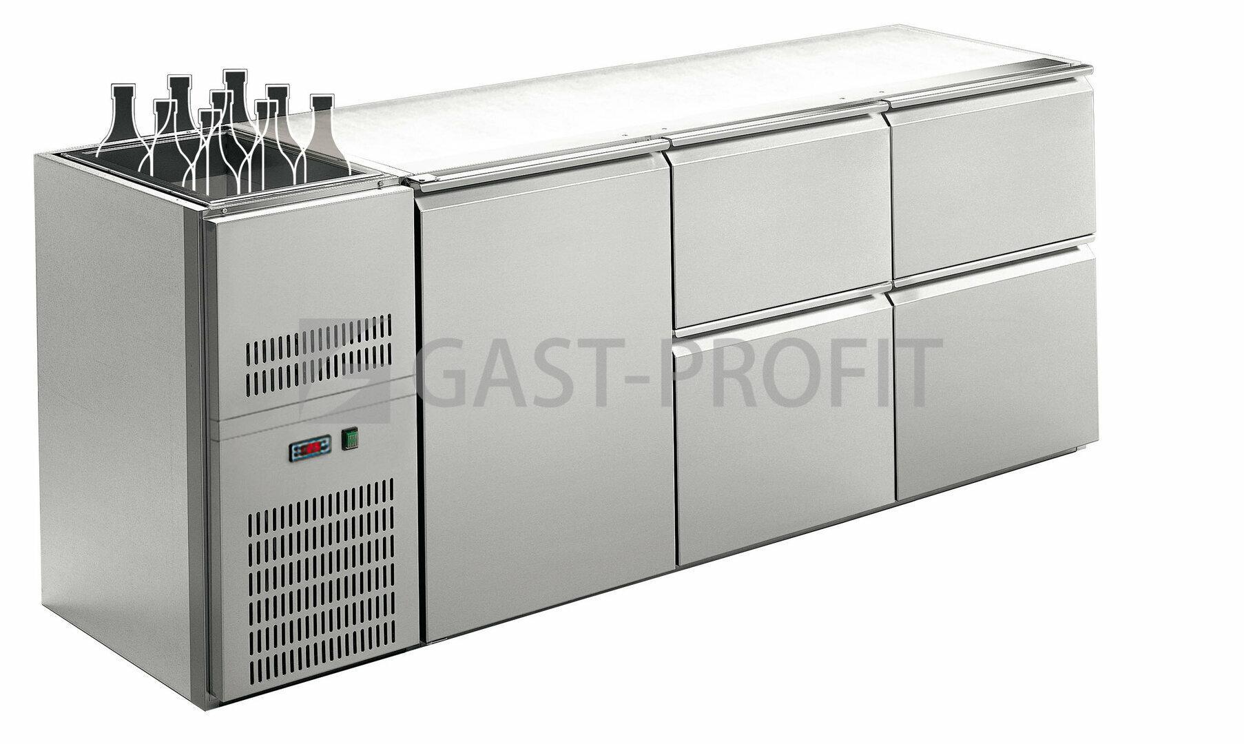 Třísekcový barový chladící stůl. Model v celonerezovém provedení (AISI 304), s chlazenou vanou (312x515xh250) nad agregátem (vpravo/vlevo). Digitální ovládání, ventilované chlazení, aut.odtávání (připojení na odpad)…