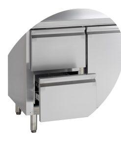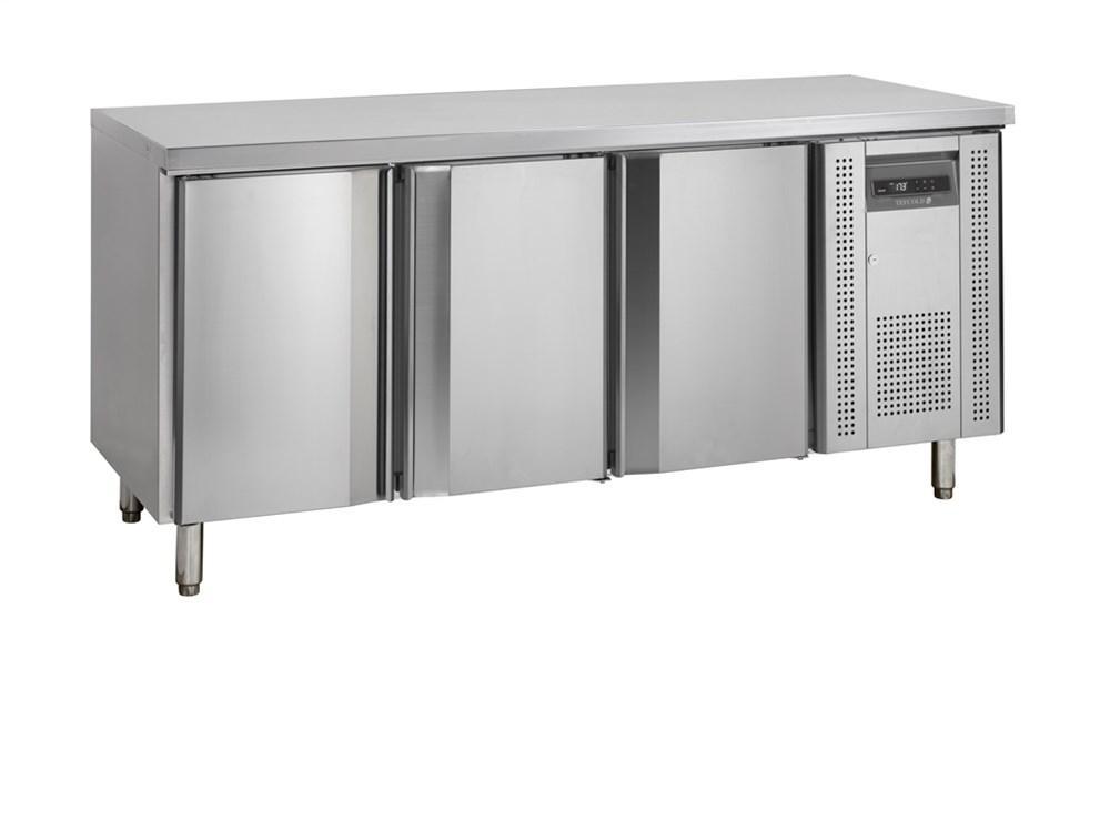 Jeho chladicí systém s ventilací udržuje stálou teplotu obsahu a elektronický regulátor umožňuje snadno nastavit teplotu podle vašich ingrediencí. Má horní panel, který lze odstranit, pokud jej chcete používat jako chladicí box pod pultem a přidat vlastní desku pultu. Nohy jsou nastavitelné, takže je možné přizpůsobit výšku stolu vašim potřebám. Chladicí stůl CK je vynikajícím doplňkem každé profesionální kuchyně. nový design, nerezová ocel, automatické odmrazování, samozavírací dveře, odstranitelná pracovní deska bez zadního lemu, nastavitelné nohy, ventilované chlazení