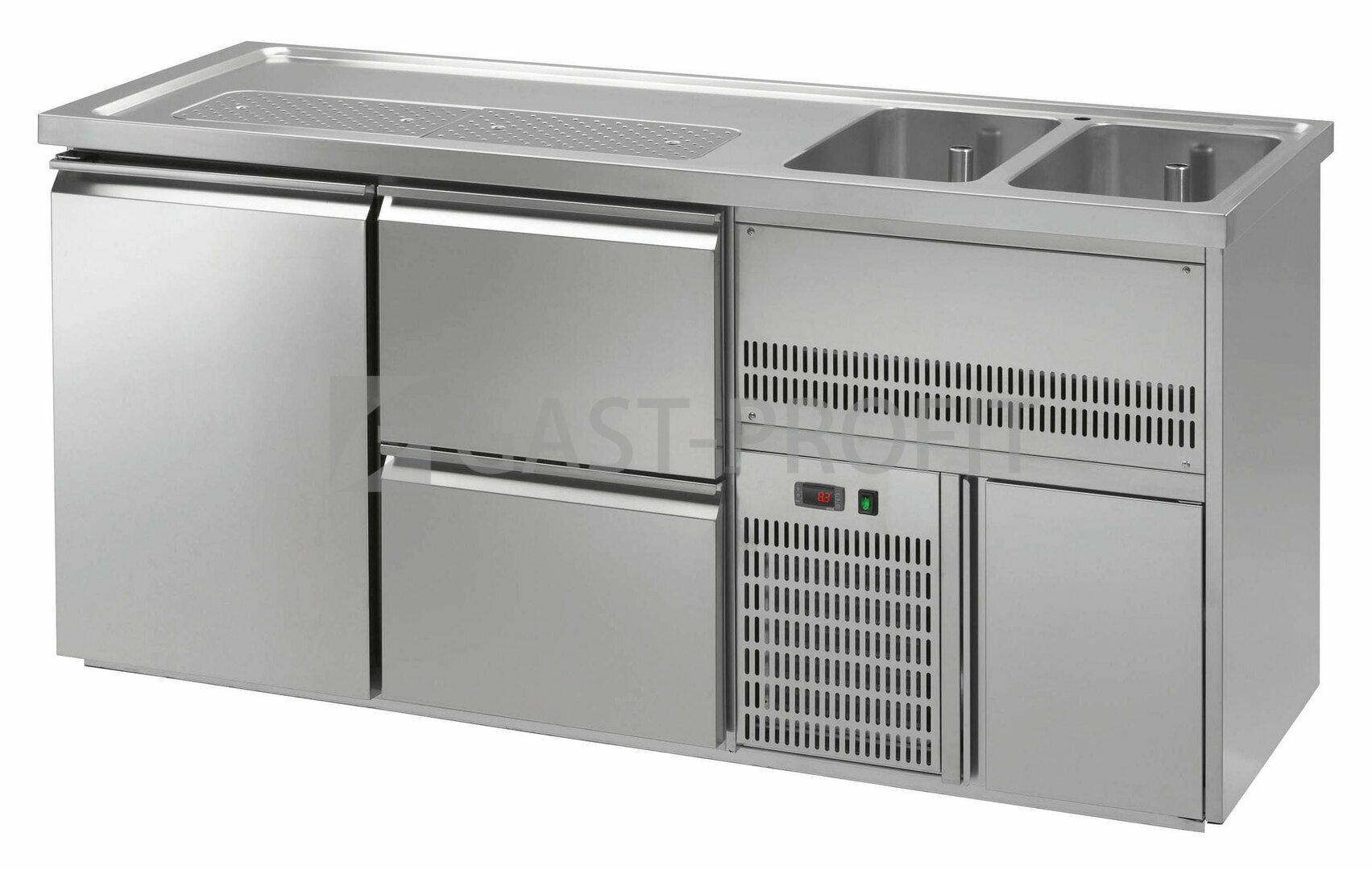 Barový a výčepní stůl – dvousekcový. Model v celonerezovém provedení vč.prolisované pracovní desky (AISI 304) s dvoudřezem (2x 300x500x300mm) nad agregátem a odkapem (950x250mm) pod výčepní stojan. Digitální ovládání, nucená cirkulace vzduchu, automa