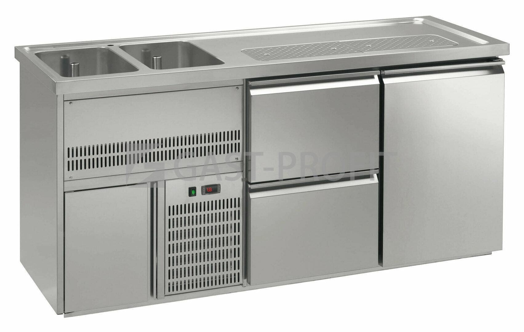Chladící barové stoly RBPD / RBPS-220E, 212E, 230E a 222 E vyrobeny v celonerezovém provedení (AISI 304) s prolisovanou pracovní deskou, odkapní plochou (950 x 250 mm) a dvoudřezem 2x (300 x 500 x…