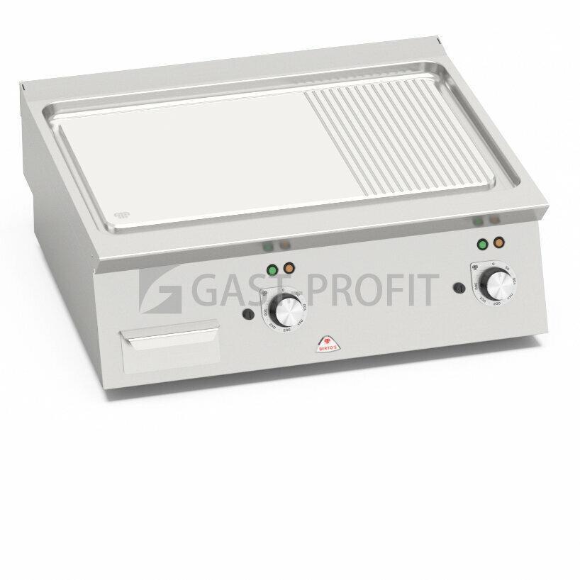 Termostatické ovládání 50 až 300°C pro přesnou a bezpečnou regulaci. Dvě zóny s nezávislým ovládáním a přesnou regulací teploty. Dvojvrstvá grilovací plotna (kombinovaná) složená z ocelového plátu a horní vrstvy z nerez oceli AISI 316 s leštěným povrchem, který umožňuje snadné čištění (odkapová plocha okolo celé grilovací desky). Zvýšené postranní lemy. Pracovní deska z kvalitní nerez oceli AISI 304 tloušťka 2 mm (20/10), přední a boční opláštění z nerezové oceli AISI 304. Dvojvrstvá grilovací plotna (umístěná v prolisované zesílené pracovní desce, tloušťka 2 mm, vybavena odtokovým otvorem) složená z ocelového plátu a horní vrstvy z nerez oceli AISI 316 s leštěným povrchem, který umožňuje snadné čištění. Nízká úroveň odlesku zvyšuje komfort při práci.