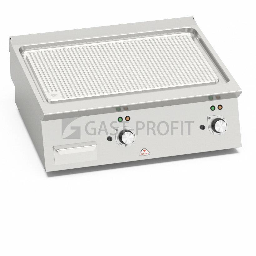 Termostatické ovládání 50 až 300°C pro přesnou a bezpečnou regulaci. Dvě zóny s nezávislým ovládáním a přesnou regulací teploty. Dvojvrstvá grilovací plotna (rýhovaná) složená z ocelového plátu a horní vrstvy z nerez oceli AISI 316 s leštěným povrchem, který umožňuje snadné čištění (odkapová plocha okolo celé grilovací desky). Zvýšené postranní lemy. Pracovní deska z kvalitní nerez oceli AISI 304 tloušťka 2 mm (20/10), přední a boční opláštění z nerezové oceli AISI 304. Dvojvrstvá grilovací plotna (umístěná v prolisované zesílené pracovní desce, tloušťka 2 mm, vybavena odtokovým otvorem) složená z ocelového plátu a horní vrstvy z nerez oceli AISI 316 s leštěným povrchem, který umožňuje snadné čištění. Nízká úroveň odlesku zvyšuje komfort při práci.