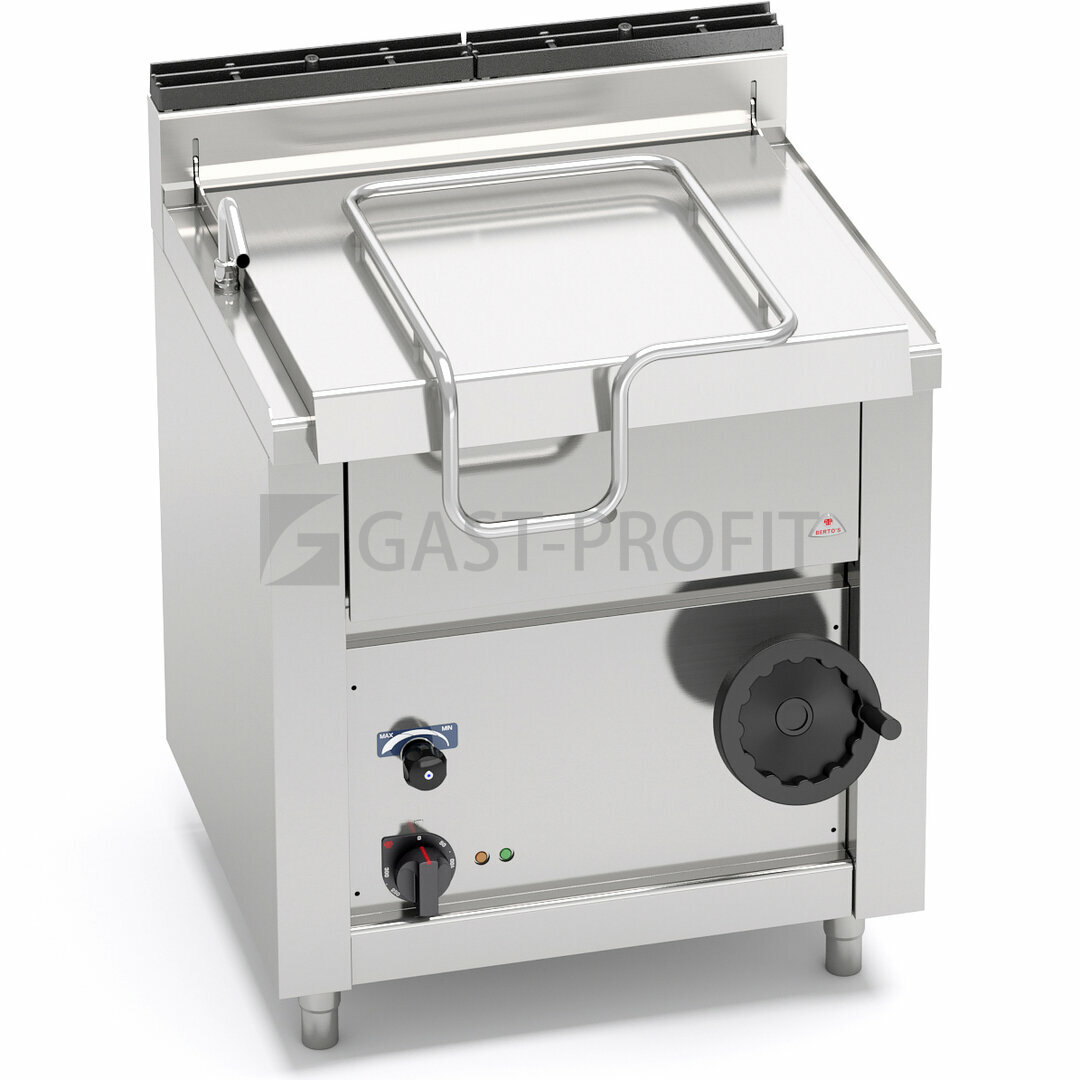 Elektrická a plynová pánev s obsahem 60 litrů se speciálním fixačním systémem vyklápění do 80°, vybavena mikrospínačem pro zastavení chodu