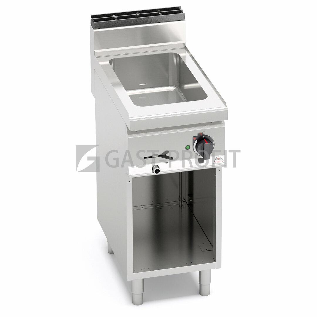 Elektrická a plynová vodní lázeň vhodná pro GN 1/1-150mm (možná kombinace GN), vypouštění kulovým kohoutem s tepelně odolným držadlem. Mechanický termostat pro nastavení požadovaného výkonu. Ohřev je prováděn spirálou nebo hořák umístěn ve dně vany. Chráněný zápalný plamínek s pojistným ventilem. Piezoelektrické zapalování. Kompaktní provedení nerezové provedení s otevřeným podstavcem. Dodáváno bez GN!