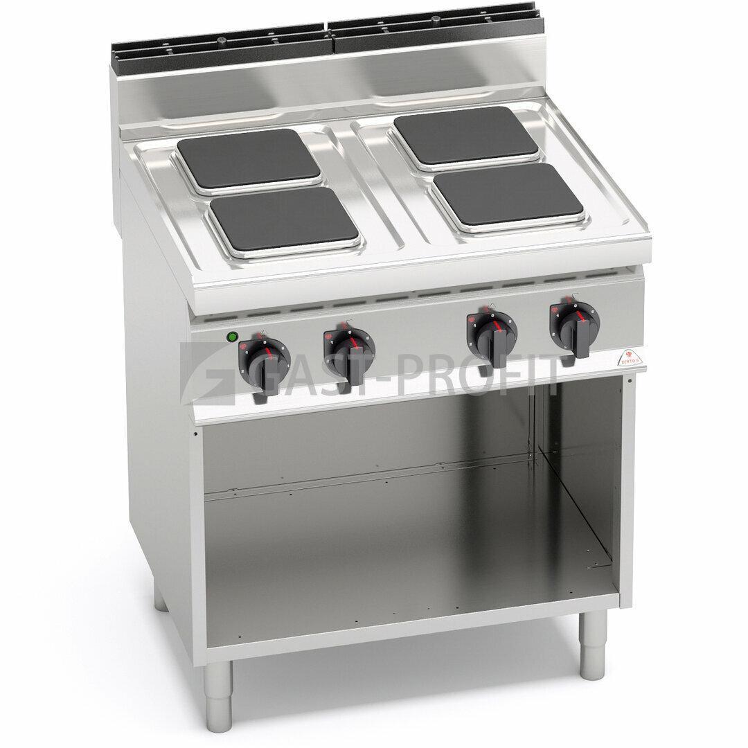 Elektrické sporáky s optimálním varným výkonem 4x plotna – 2,6kW. Šest regulačních stupňů topného výkonu ploten, elektrická multifunkční trouba FE – statická pro GN 2/1 s ovládáním jednotlivých spodních a horních těles (4,5 + 3kW), nebo horkovzdušná trouba FE1 – ventilovaná pro GN 1/1. Sporáky jsou vyrobeny z kvalitní nerezové oceli AISI 304 se zaoblenými hranami pro bezpečnou práci a snadnou údržbu.Litinové varné plotny s bezpečnostním termostatem. Elektrická vařidla E7P4M a E7PQ4M v základu dovávána bez dvířek (viz. příslušenství – křídlová dvířka 2P).