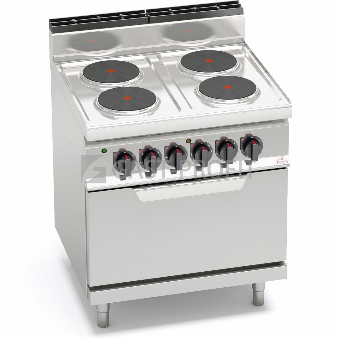 Elektrické sporáky s optimálním varným výkonem 4x plotna – 2,6kW. Šest regulačních stupňů topného výkonu ploten, elektrická multifunkční trouba FE – statická pro GN 2/1 s ovládáním jednotlivých spodních a horních těles (4,5 + 3kW), nebo horkovzdušná trouba FE1 – ventilovaná pro GN 1/1. Sporáky jsou vyrobeny z kvalitní nerezové oceli AISI 304 se zaoblenými hranami pro bezpečnou práci a snadnou údržbu.Litinové varné plotny s bezpečnostním termostatem. Elektrická vařidla E7P4M a E7PQ4M v základu dovávána bez dvířek (viz. příslušenství – křídlová dvířka 2P).