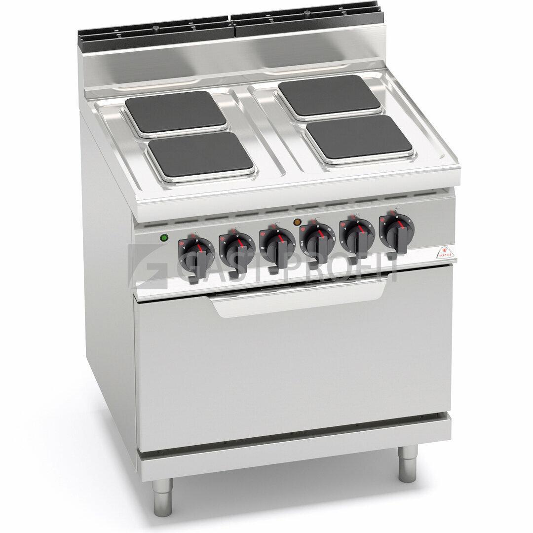 Sporák s troubou je vybaven varnými plotýnkami z litiny. Pracovní plochu lze doplnit o ocelovou výplň prostoru mezi plotnami, čímž se dosáhne celistvé pracovní plochy. Teplota je regulována nezávisle nastavitelnými spínači. Přímá kontrola teploty umožňuje významně uspořit energie. Topná tělesa jsou hermeticky uzavřena v jednom celku, který je lisován v rovině do varné desky. Pracovní plocha a opláštění z nerez oceli AISI 304. Litinová varné plotýnky s bezpečnostním termostatem a regulací výkonu. Kompaktní provedení s otevřeným podstavcem. Konvekční trouba vhodná pro GN 1/1, nebo model se statickou multifunkční troubou pro GN 2/1. Trouby mají nově zesílené litinové dno a jsou vybaveny kvalitním těsněním dveří.