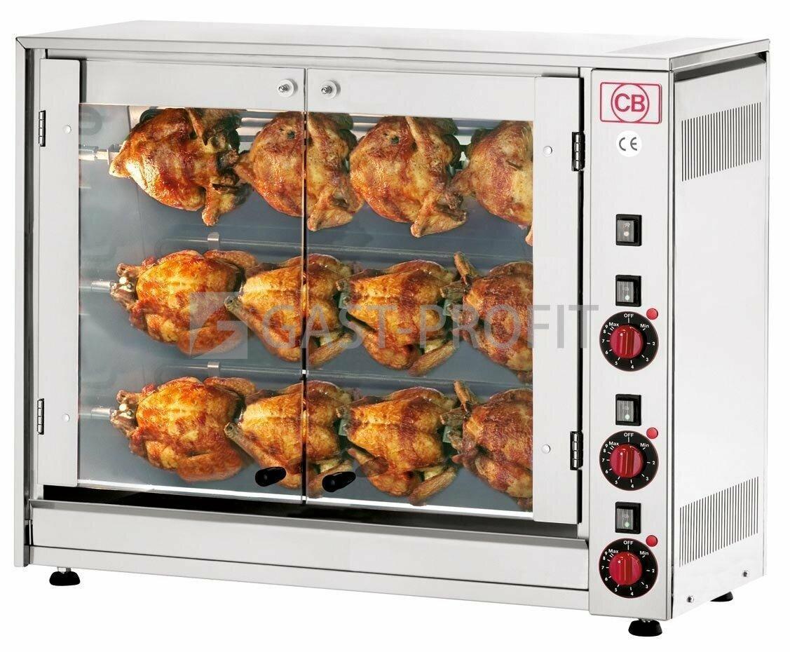 Elektrický gril na kuřata E-12P-S3. celonerezové provedení ovládání jednotlivých jehel prosklená přední dvířka vnitřní osvětlení spodní odkapová miska Ve standardu základní špízy na grilování kuřat. Příplatkově možno dodat náhradní jehly, koše..