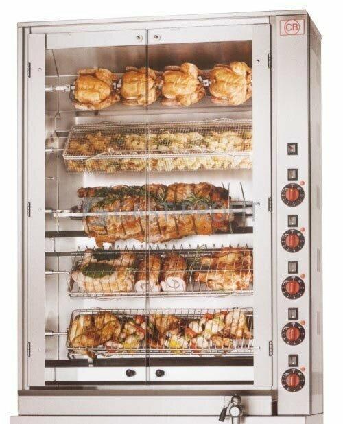 Elektrický gril na kuřata E-30 P. celonerezové provedení ovládání jednotlivých jehel prosklená přední dvířka vnitřní osvětlení spodní odkapová miska výpustný kohout Možno dodat náhradní jehly, koše, spony atd.