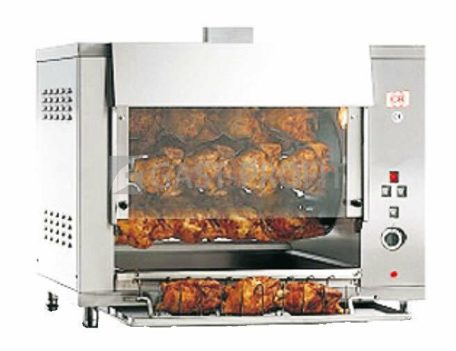 Gril v základním provedení s jehlou na kuřata. Prosklený ze dvou stran, vnitřní osvětlení. Možno dodat náhradní jehly, koše, spony..