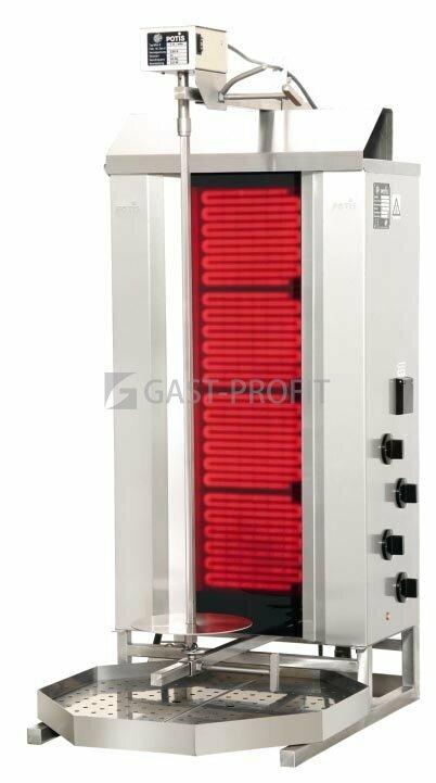 Elektrický gril na gyros, model CE4 od Německé firmy POTIS. Kapacita 70kg. Model CE4 má pohon jehly umístěn nahoře a je osazen tepelným krytem motoru. Posuv vzdálenosti motoru, jehly a naklánění jehly umožňuje lépe regulovat teplotu v jednotlivých úrovních tepelně opracovávaného produktu. Nové sklokeramické krytí těles ROBAX Ceramic Glass (snadná údržba a prodloužení životnosti topných spirál).