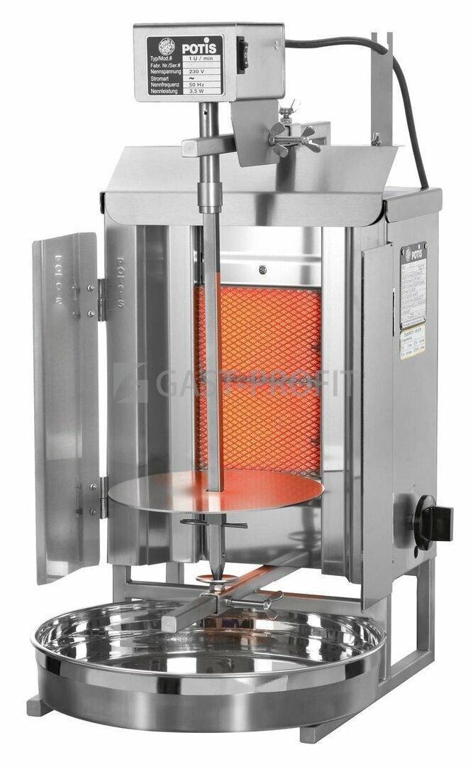 Plynový gril na gyros, model GD1/S od Německé firmy POTIS. Kapacita 7kg. Model GD1/S má pohon jehly umístěn nahoře a jsou osazeny tepelným krytem motoru. Posuv vzdálenosti motoru, jehly a naklánění jehly umožňuje lépe regulovat teplotu v jednotlivých úrovních tepelně opracovávaného produktu.