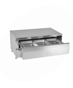 Kombinovaný chladicí/mrazicí stůl s dvěma zásuvkami v celonerezovém provedení s ventilovaným chlazením pro rychlé dosažení a udržení požadované teploty. Stiskem jednoho tlačítka lze zvolit mezi chladicím a mrazicím režimem. dvě zásuvky s individuálním přepínáním chlazení /mrazení, snadná přepínání mezi chlazením a mrazením, maximalizovaný úložný prostor, ventilované chlazení pro rychlé snížení teploty a zajištění rovnoměrné teploty, automatické odmrazování, velký úložný prostor, maximální nosnost zásuvky: 60 kg, maximální zatížitelnost horní desky: 240 kg
