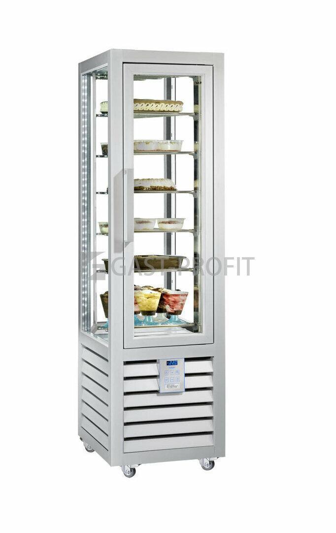 Mrazící panoramatická cukrářská vitrína SILFER, řady NEO, model NGL250S (250 L) v moderním hranatém designu, určena pro prezentaci a uchovávání mražených dortů a cukrářských výrobků. Vitrína je v elegantním hranatém celokovovém provedení (Al hranatý profil s elox.úpravou), statické chlazení s vlhkostí vzduchu 40%, objem 250 litrů, 6 výparníkových mrazících polic 295x460mm (pevných), teplotní rozsah -15°C až -25°C při okolní teplotě do +30°C, manuální odtávání, vrstvené nemlživé sklo, dvojité svislé LED osvětlení (2x 1200 Im) v protilehlých rozích, zátěžová směrová kolečka (2 s brzdou), 1x křídlové dveře a elegatní ergonomické madlo, nové dotykové elektronické ovládání "Touch" s digitálním teploměrem.