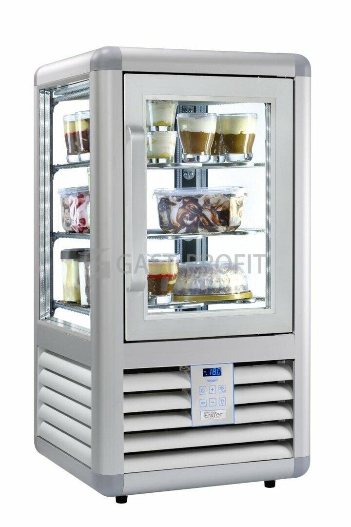 Mrazící panoramatická vitrína SILFER, řady CURVE, model CEB100S (98L). Statické chlazení, elektronické ovládání, digitální teploměr, manuální odmrazování. Výkonné kvalitní 2x LED rohové osvětlení (2x 1200 Im). 1x křídlové prosklené dveře ze strany…