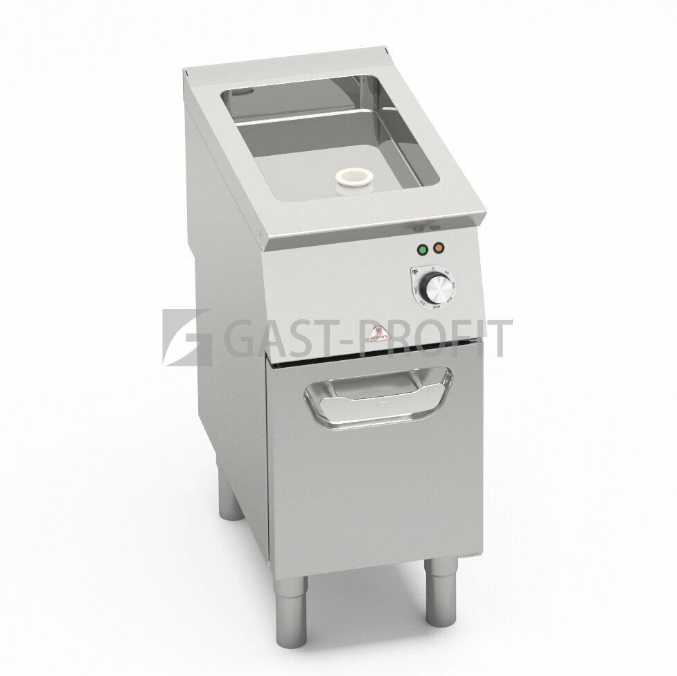 Konstrukce z ušlechtilé nerez oceli, vnější povrchy s úpravou Scotch Brite. Řízení termostatickým spínačem 100 až 300°C pro přesnou a bezpečnou regulaci. Plotna vany COMPOUND o síle 15 mm je složená z ocelového plátu a horní vrstvy z nerez oceli AISI 316 s leštěným povrchem, který umožňuje snadné čištění (odkapový odpadní otvor ø50 mm) s vyústěním do ocelového zásobníku GN1/1. Rovnoměrné zahřívání dna prostřednictvím topných těles Incoloy-800 umístěných ke spodní části dna nádrže a potažené izolačním materiálem.