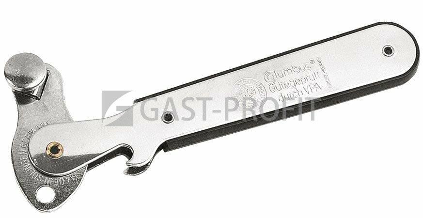 Jednoduchý otvírák konzerv v kovovém provedení s rozměry 165×25 mm.