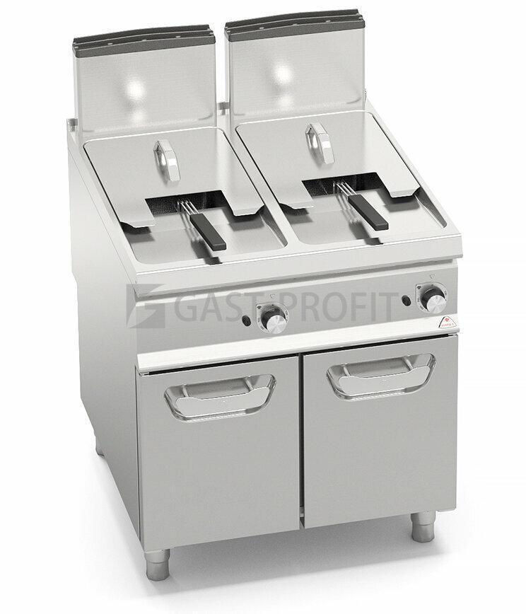 Dvoupláštové provedení vany s nepřímým způsobem ohřevu. Ovládání teploty termostatickým ventilem od 110-190°C s přesným zjišťováním teploty díky senzorům ve vaně, elektrické zapalování. Elektromechanické ovládání s nestavením teploty 0°C do 190°C. Bezpečnostní termostat s manuálním restartem. Vypouštění kulovým kohoutem s tepelně odolným držadlem. Ve standardu vybavena dvěma koši. Pracovní plocha z nerez oceli AISI 304 tloušťka 20/10, přední a boční panely z nerezové oceli AISI 304. Nerezový oválný voštinový hořák zajišťuje rovnoměrný ohřev velké plochy přes výměník tepla umístěný přímo ve vaně. Chráněný zápalný plamínek s pojistným ventilem. Piezoelektrické zapalování s gumovou ochranou. Vana nerez ocel AISI 304 se zaoblenými hranami, studená zóna pod hořákem pro slévání zbytků. Na vrchu se zaoblenou hranou pro zavěšení koše při skapávání oleje.