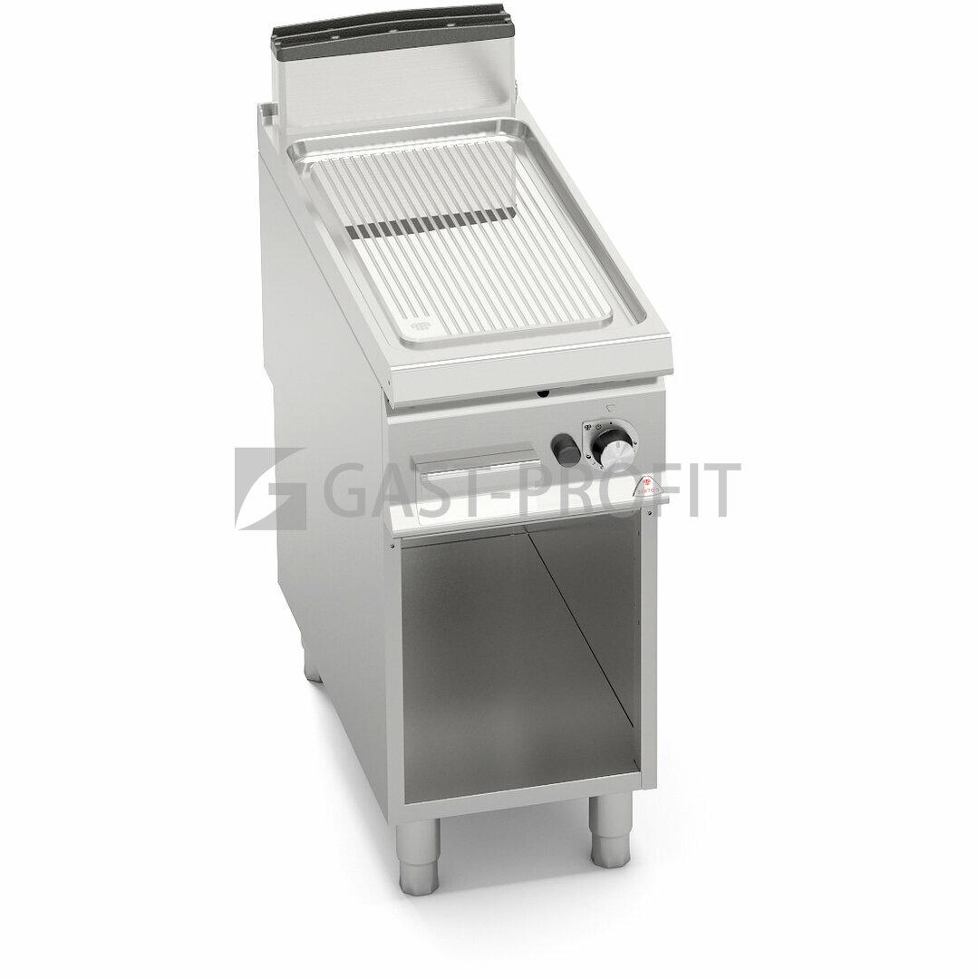 Termostatický ventil 30 až 300°C pro přesnou a bezpečnou regulaci. Termočlánek a chráněný zápalný plamínek. Dvojvrstvá grilovací plotna složená z ocelového plátu a horní vrstvy z nerez oceli AISI 316 s leštěným povrchem, který umožňuje snadné čištění. Nízká úroveň odlesku zvyšuje komfort při práci. Zvýšené postranní lemy. Kompaktní provedení s otevřeným podstavcem. Zvýšený odtah 120 mm není součástí ! Kompletní sortiment plynových a elektrických ploten s různým provedením grilovací plochy. Lze na nich připravovat pokrmy tzv. "kontaktem" a to nejcitlivějším způsobem. Jednotný systém distribuce tepla zaručuje rovnoměrné grilování po celé pracovní ploše, velké energetické úspory a zlepšení pracovního prostředí. Při grilování se přirozeně tvoří zbytkový olej, který je odváděn a shromažďován ve velké odpadní nádobce. Teflonová zátka, odolná vůči vysokým teplotám není součástí smažící plotny.