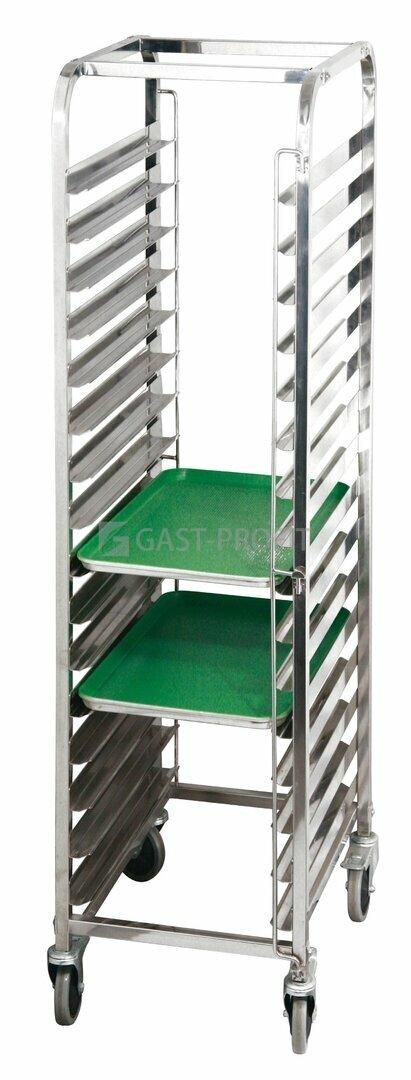 Robustní regálový vozík (jeklový) v celonerezovém provedení s odolnými otočnými kolečky (2x bržděnými). Model je v provedení pro plechy a tácy 16x 600x400mm s roztečí zásuvů 80mm, zámkem zabraňujícím samovolnému uvolnění nádob ze vsunů. Vozíky jsou..