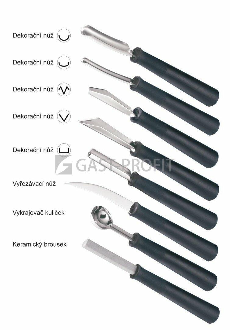 Dekorační sada od Giesser Messer. Obsahuje pět dekoračních nožů různých tvarů, vyřezávací nůž, vykrajovač kuliček a keramický brousek.