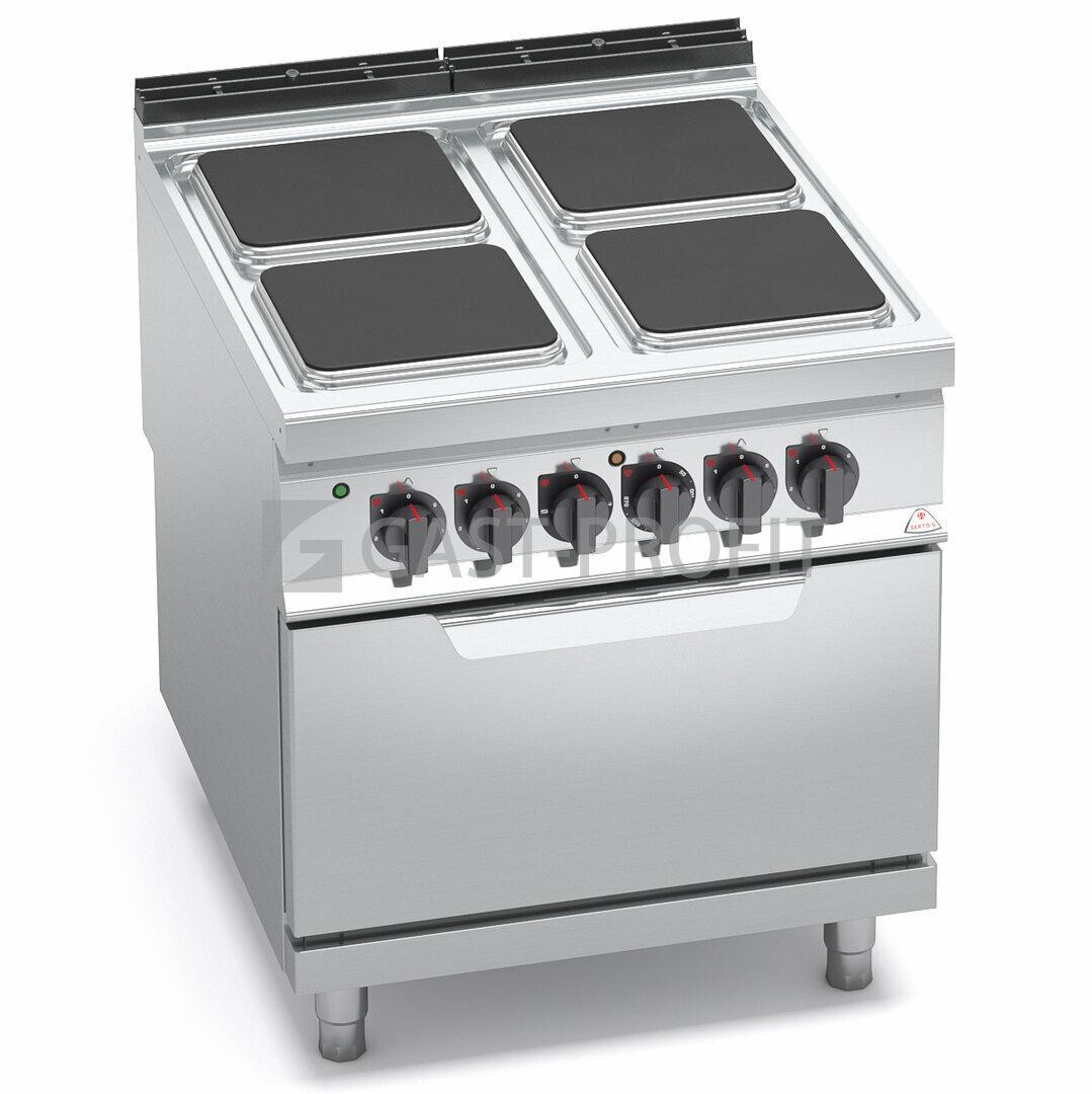 Sporák je vybaven čtyřmi varnými plotýnkami z litiny s plochou 300×300 mm. Každá plotýnka má výkon 3,5 kW a dosáhne teploty 400 °C. Pracovní plochu lze doplnit o ocelovou výplň prostoru mezi plotnami, čímž se dosáhne celistvé pracovní plochý.Teplota je regulována nezávisle nastavitelnými spínači. Přímá kontrola teploty umožňuje významně uspořit energie. Topná tělesa jsou hermeticky uzavřena v jednom celku, který je lisován v rovině do varné desky. Konvekční trouba vhodná pro GN 1/1, nebo model se statickou multifunkční troubou pro GN 2/1. Trouby mají nově zesílené litinové dno a jsou vybaveny kvalitním těsněním dveří.