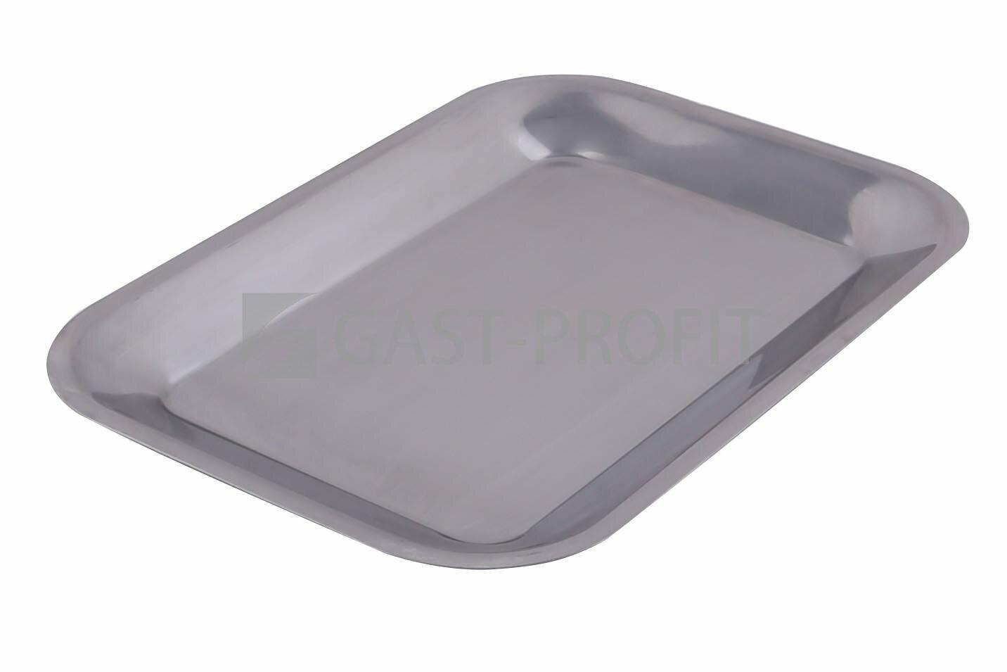 Lisovaný nerezový tác o síle materiálu 1 mm s oblými rohy.
