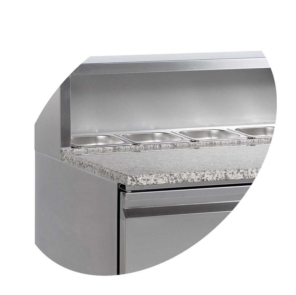 Řada PT chladicích pizza stolů je vyrobena z nerezové oceli SS304. Má žulovou desku, která je pro přípravu pizzy ideální, protože žula zůstává chladná a těsto se na ni méně lepí. Stoly jsou k dispozici v několika velikostech se 2 nebo 3 dvířky. Také je možné pořídit si přizpůsobenou variantu se zásuvkami. Dodává se s horní jednotkou pro gastronádoby GN nebo bez ní – horní jednotku lze dodatečně namontovat. Ve vrchní části je možné vložit GN 1/6 * 5 ks pro model PT 920 a 8 ks GN 1/6 pro model PT 930. GN nejsou součástí. nerezová ocel, žulová pracovní deska, chladicí vana pro gastronádoby GN1/6, automatické odmrazování, dveře, nastavitelné nožky, chlazení s pomocným ventilátorem
