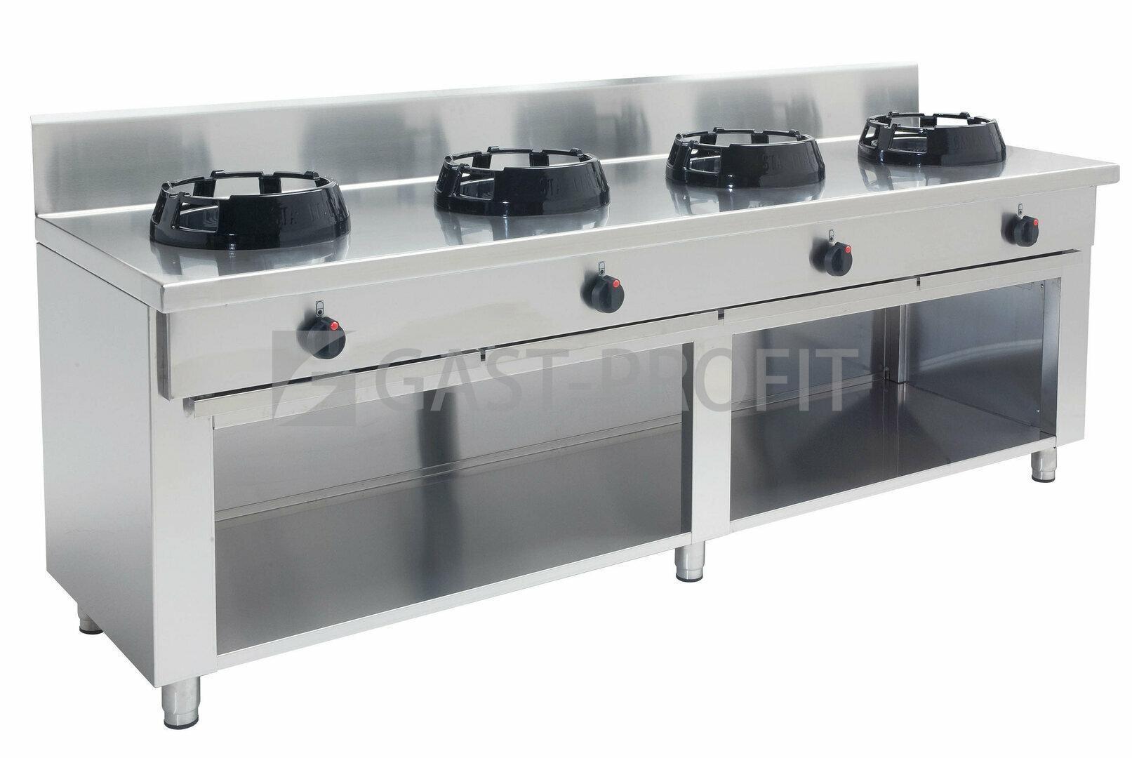 Na objednávku lze wok sporáky volitelně vybavit alternativními hořáky typu C (9,5 kW) a S (21,0 kW), což je nutné specifikovat v objednávce. Výrobce na poptávku (příplatkově) umožňuje zákazníkem zvolit různé rozmístění hořáků, specifikaci celkového rozměru a individuální výšky. Robustní provedení v nerezové oceli AISI 304 18/10. Zesílená nerezová varná deska 2,5 mm v přístěnném provedení se zadním zvýšeným lemem 200 mm a otevřeným skříňovým podstavcem se spodní policí. Skříň je osazena výškově stavitelnými nohami.