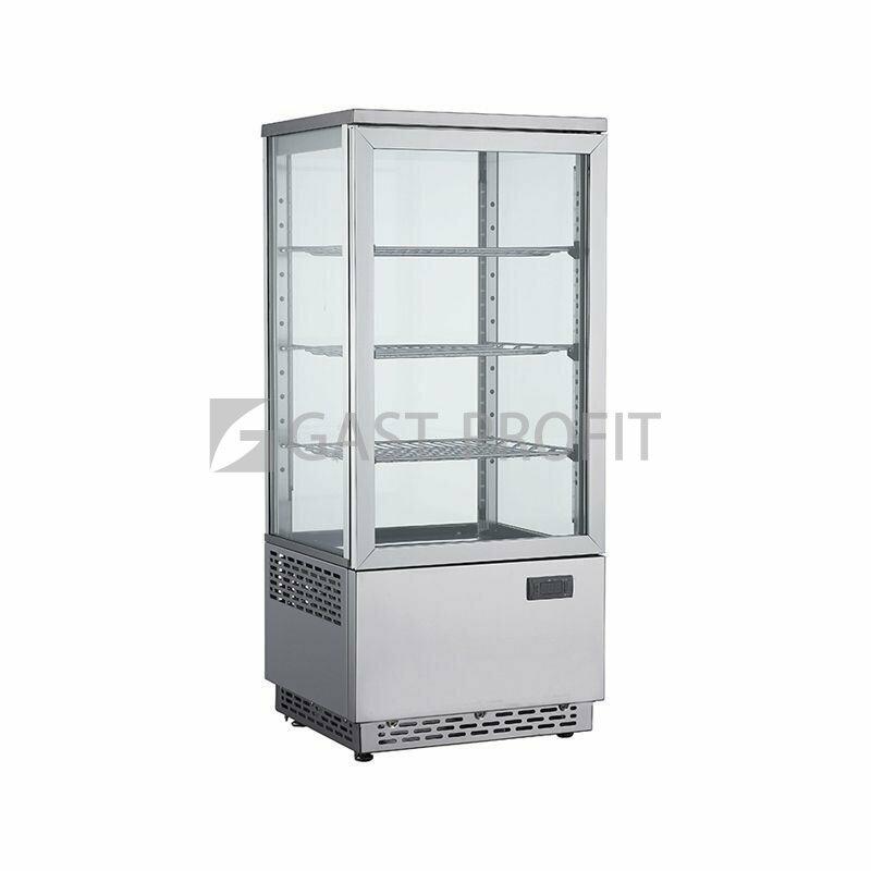 Chladicí panoramatická vitrína RT-78L-8 v elegantním nerezovém provedení určena k prezentaci, uskladnění a prodeji potravin. Vitrína je ze čtyř stran prosklená (dvojitá izolovaná skla) s intenzivním 4x LED rohovým osvětlením, která neohřívá vnitřní prostor a výrazně napomáhají prezentaci a prodeji ve všech patrech. Ovládána digitálním regulátorem s displejem zobrazujícím teploty. Systém automatického odtávání, masivní chromové police (výškově stavitelné). Nastavitelné nožičky.